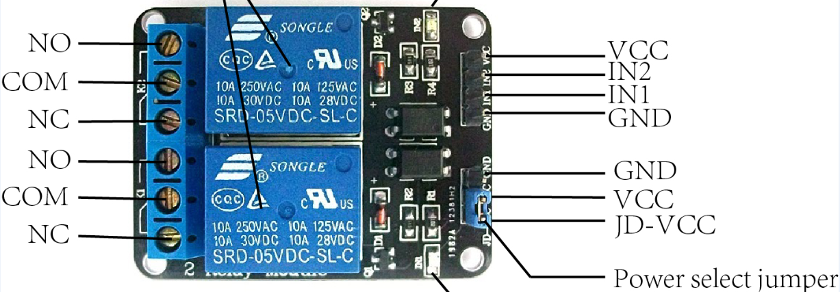 Chân IN: kích mở relay Jump H/L level trigger: thiết lập mức điều khiển relay.