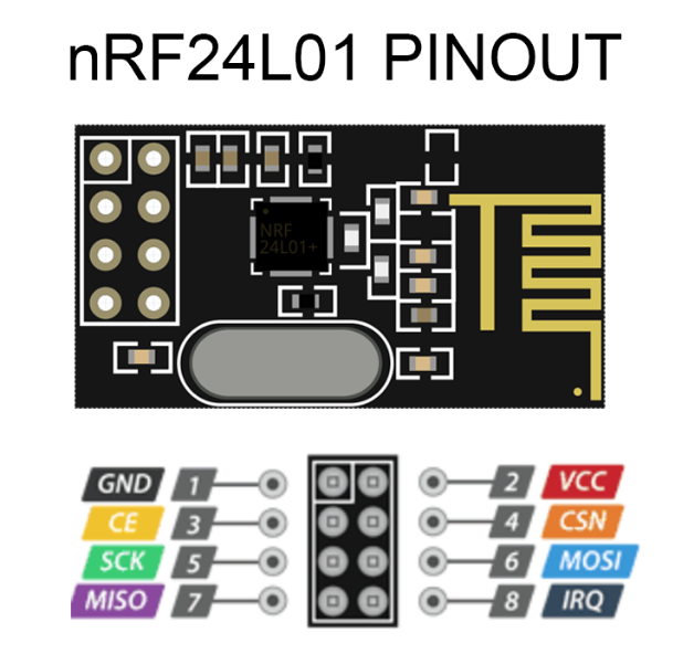 - Thứ tự chân giao tiếp: GND, VCC, CS, CSN, SCK, MOSI, MISO, IQR.