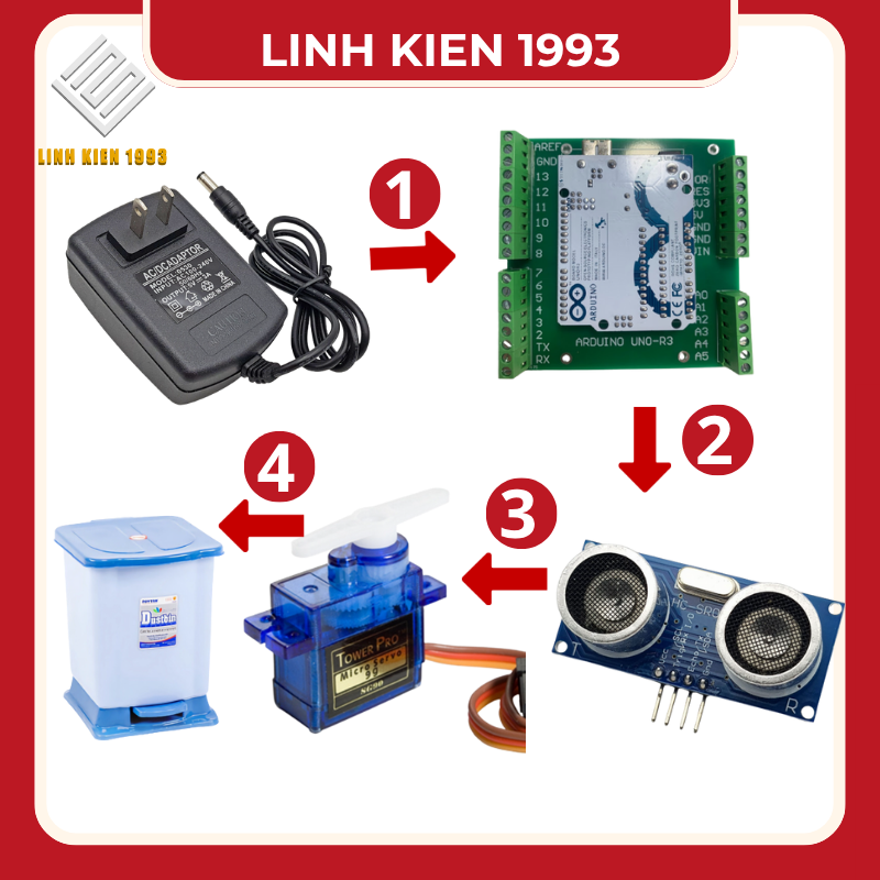 | Cảm biến siêu âm HC-SR04 | Dùng để đo khoảng cách giữa vật thể (tay người) và thùng rác. |
